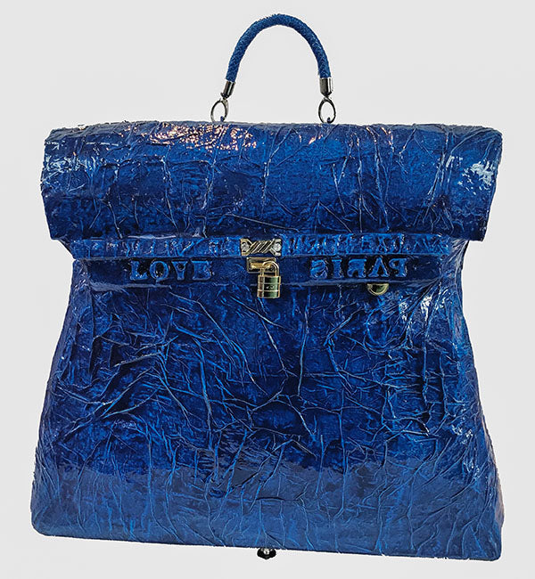 Wood frame with plaster fill, covered with lacquered leather and acrylic paint. Artwork is in excellent condition. Certificate of authenticity included.